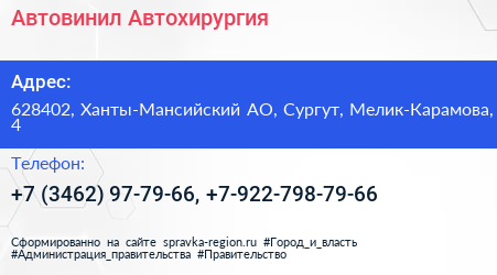 Автовинил Автохирургия по адресу 628402, Ханты-Мансийский АО, Сургут, Мелик-Карамова, 4 в дальнейшем Организация, размещена в следующих категориях: