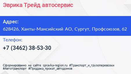 Эврика-Трейд, автосервис по адресу 628426, Ханты-Мансийский АО, Сургут, Профсоюзов, 62 в дальнейшем Организация, размещена в следующих категориях: