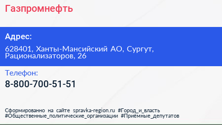 Газпромнефть по адресу 628401, Ханты-Мансийский АО, Сургут, Рационализаторов, 26 в дальнейшем Организация, размещена в следующих категориях: