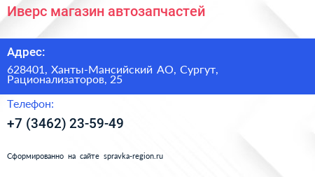Иверс, магазин автозапчастей по адресу 628401, Ханты-Мансийский АО, Сургут, Рационализаторов, 25 в дальнейшем Организация, размещена в следующих категориях: