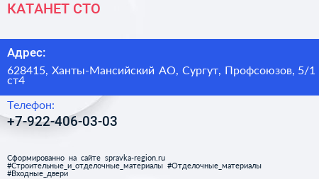 КАТАНЕТ, СТО по адресу 628415, Ханты-Мансийский АО, Сургут, Профсоюзов, 5/1 ст4 в дальнейшем Организация, размещена в следующих категориях: