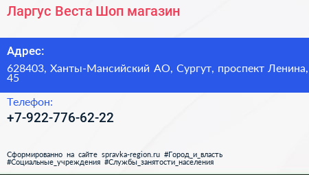 Ларгус Веста Шоп, магазин по адресу 628403, Ханты-Мансийский АО, Сургут, проспект Ленина, 45 в дальнейшем Организация, размещена в следующих категориях: