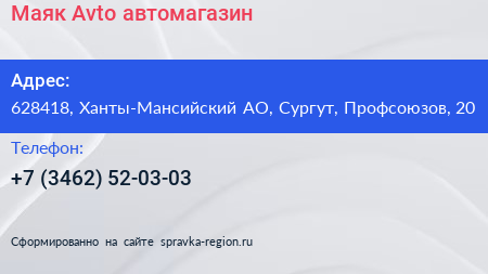 Маяк-Avto, автомагазин по адресу 628418, Ханты-Мансийский АО, Сургут, Профсоюзов, 20 в дальнейшем Организация, размещена в следующих категориях: