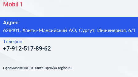 Mobil 1 по адресу 628401, Ханты-Мансийский АО, Сургут, Инженерная, 6/1 в дальнейшем Организация, размещена в следующих категориях: