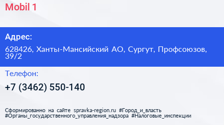Mobil 1 по адресу 628426, Ханты-Мансийский АО, Сургут, Профсоюзов, 39/2 в дальнейшем Организация, размещена в следующих категориях: