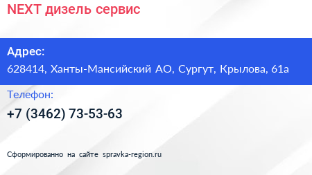 NEXT, дизель сервис по адресу 628414, Ханты-Мансийский АО, Сургут, Крылова, 61а в дальнейшем Организация, размещена в следующих категориях: