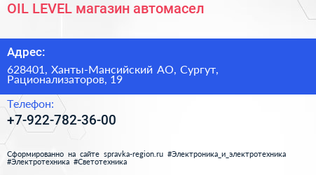 OIL LEVEL, магазин автомасел по адресу 628401, Ханты-Мансийский АО, Сургут, Рационализаторов, 19 в дальнейшем Организация, размещена в следующих категориях: