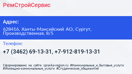 РемСтройСервис по адресу 628416, Ханты-Мансийский АО, Сургут, Производственная, 8/5 в дальнейшем Организация, размещена в следующих категориях: