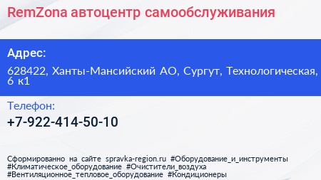 RemZona, автоцентр самообслуживания по адресу 628422, Ханты-Мансийский АО, Сургут, Технологическая, 6 к1 в дальнейшем Организация, размещена в следующих категориях: