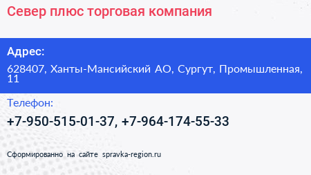 Север плюс, торговая компания по адресу 628407, Ханты-Мансийский АО, Сургут, Промышленная, 11 в дальнейшем Организация, размещена в следующих категориях: