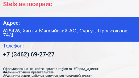 Stels, автосервис по адресу 628426, Ханты-Мансийский АО, Сургут, Профсоюзов, 74/1 в дальнейшем Организация, размещена в следующих категориях: