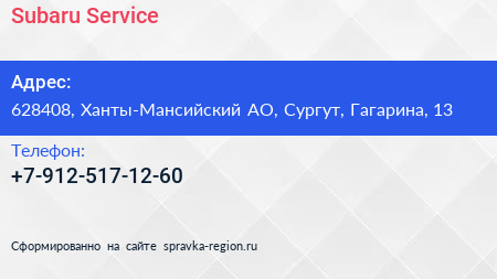 Subaru Service по адресу 628408, Ханты-Мансийский АО, Сургут, Гагарина, 13 в дальнейшем Организация, размещена в следующих категориях: