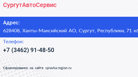 СургутАвтоСервис по адресу 628408, Ханты-Мансийский АО, Сургут, Республики, 71 к6 в дальнейшем Организация, размещена в следующих категориях: