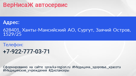 ВерНисаЖ, автосервис по адресу 628401, Ханты-Мансийский АО, Сургут, Заячий Остров, 1529/25 в дальнейшем Организация, размещена в следующих категориях: