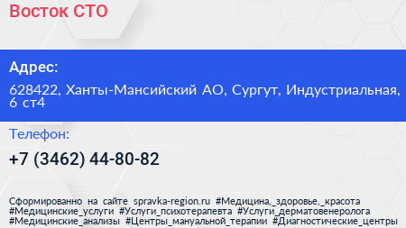 Восток, СТО по адресу 628422, Ханты-Мансийский АО, Сургут, Индустриальная, 6 ст4 в дальнейшем Организация, размещена в следующих категориях: