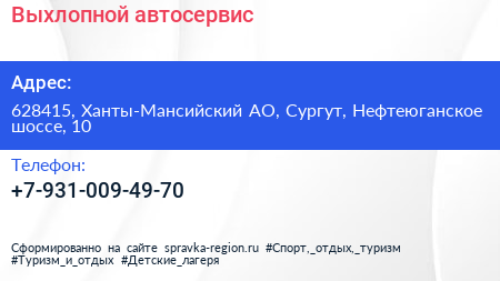 Выхлопной, автосервис по адресу 628415, Ханты-Мансийский АО, Сургут, Нефтеюганское шоссе, 10 в дальнейшем Организация, размещена в следующих категориях: