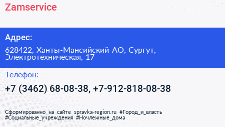 Zamservicе по адресу 628422, Ханты-Мансийский АО, Сургут, Электротехническая, 17 в дальнейшем Организация, размещена в следующих категориях: