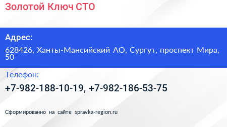 Золотой Ключ, СТО по адресу 628426, Ханты-Мансийский АО, Сургут, проспект Мира, 50 в дальнейшем Организация, размещена в следующих категориях: