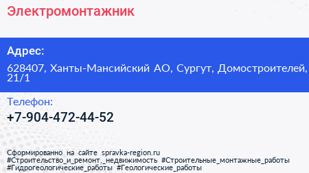 Электромонтажник по адресу 628407, Ханты-Мансийский АО, Сургут, Домостроителей, 21/1 в дальнейшем Организация, размещена в следующих категориях: