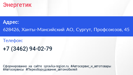 Энергетик по адресу 628426, Ханты-Мансийский АО, Сургут, Профсоюзов, 45 в дальнейшем Организация, размещена в следующих категориях: