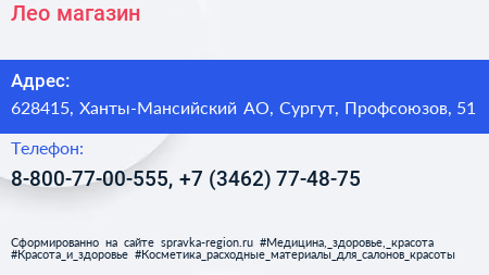 Лео, магазин по адресу 628415, Ханты-Мансийский АО, Сургут, Профсоюзов, 51 в дальнейшем Организация, размещена в следующих категориях: