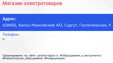 Магазин электротоваров по адресу 628402, Ханты-Мансийский АО, Сургут, Геологическая, 9 в дальнейшем Организация, размещена в следующих категориях:
