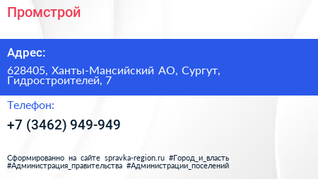 Промстрой по адресу 628405, Ханты-Мансийский АО, Сургут, Гидростроителей, 7 в дальнейшем Организация, размещена в следующих категориях: