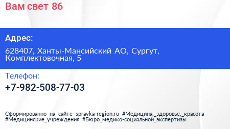 Вам свет 86 по адресу 628407, Ханты-Мансийский АО, Сургут, Комплектовочная, 5 в дальнейшем Организация, размещена в следующих категориях: