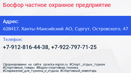 Босфор, частное охранное предприятие по адресу 628417, Ханты-Мансийский АО, Сургут, Островского, 47 в дальнейшем Организация, размещена в следующих категориях: