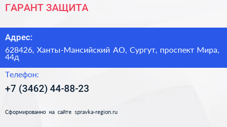 ГАРАНТ-ЗАЩИТА по адресу 628426, Ханты-Мансийский АО, Сургут, проспект Мира, 44д в дальнейшем Организация, размещена в следующих категориях: