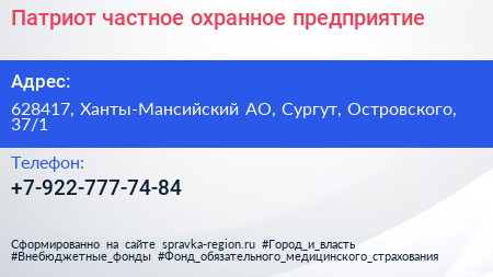 Патриот, частное охранное предприятие по адресу 628417, Ханты-Мансийский АО, Сургут, Островского, 37/1 в дальнейшем Организация, размещена в следующих категориях: