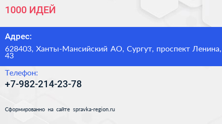 1000 ИДЕЙ по адресу 628403, Ханты-Мансийский АО, Сургут, проспект Ленина, 43 в дальнейшем Организация, размещена в следующих категориях: