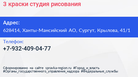 3 краски, студия рисования по адресу 628414, Ханты-Мансийский АО, Сургут, Крылова, 41/1 в дальнейшем Организация, размещена в следующих категориях: