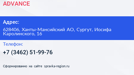 ADVANCE по адресу 628406, Ханты-Мансийский АО, Сургут, Иосифа Каролинского, 16 в дальнейшем Организация, размещена в следующих категориях: