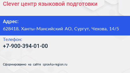 Clever, центр языковой подготовки по адресу 628418, Ханты-Мансийский АО, Сургут, Чехова, 14/5 в дальнейшем Организация, размещена в следующих категориях: