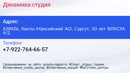 Динамика, студия по адресу 628426, Ханты-Мансийский АО, Сургут, 50 лет ВЛКСМ, 4/2 в дальнейшем Организация, размещена в следующих категориях: