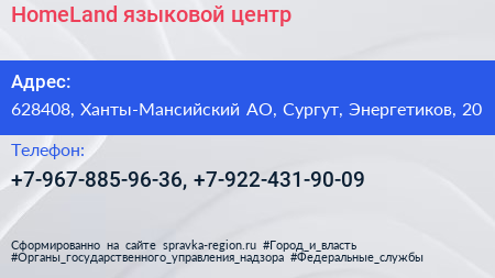 HomeLand, языковой центр по адресу 628408, Ханты-Мансийский АО, Сургут, Энергетиков, 20 в дальнейшем Организация, размещена в следующих категориях: