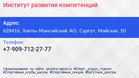 Институт развития компетенций по адресу 628416, Ханты-Мансийский АО, Сургут, Майская, 10 в дальнейшем Организация, размещена в следующих категориях: