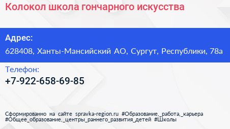 Колокол, школа гончарного искусства по адресу 628408, Ханты-Мансийский АО, Сургут, Республики, 78а в дальнейшем Организация, размещена в следующих категориях:
