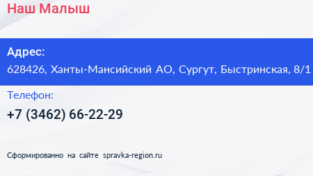 Наш Малыш по адресу 628426, Ханты-Мансийский АО, Сургут, Быстринская, 8/1 в дальнейшем Организация, размещена в следующих категориях: