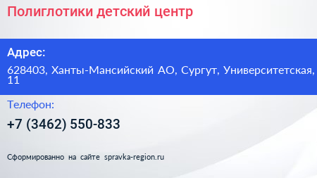 Полиглотики, детский центр по адресу 628403, Ханты-Мансийский АО, Сургут, Университетская, 11 в дальнейшем Организация, размещена в следующих категориях:
