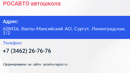 РОСАВТО, автошкола по адресу 628416, Ханты-Мансийский АО, Сургут, Ленинградская, 1/2 в дальнейшем Организация, размещена в следующих категориях: