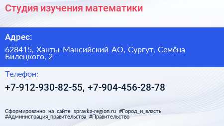 Студия изучения математики по адресу 628415, Ханты-Мансийский АО, Сургут, Семёна Билецкого, 2 в дальнейшем Организация, размещена в следующих категориях: