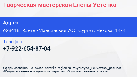 Творческая мастерская Елены Устенко по адресу 628418, Ханты-Мансийский АО, Сургут, Чехова, 14/4 в дальнейшем Организация, размещена в следующих категориях: