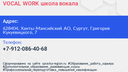 VOCAL WORK, школа вокала по адресу 628404, Ханты-Мансийский АО, Сургут, Григория Кукуевицкого, 7 в дальнейшем Организация, размещена в следующих категориях: