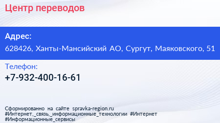 Центр переводов по адресу 628426, Ханты-Мансийский АО, Сургут, Маяковского, 51 в дальнейшем Организация, размещена в следующих категориях: