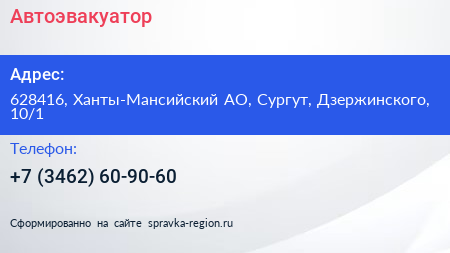 Автоэвакуатор+ по адресу 628416, Ханты-Мансийский АО, Сургут, Дзержинского, 10/1 в дальнейшем Организация, размещена в следующих категориях: