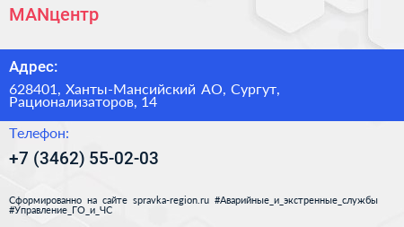 MANцентр по адресу 628401, Ханты-Мансийский АО, Сургут, Рационализаторов, 14 в дальнейшем Организация, размещена в следующих категориях: