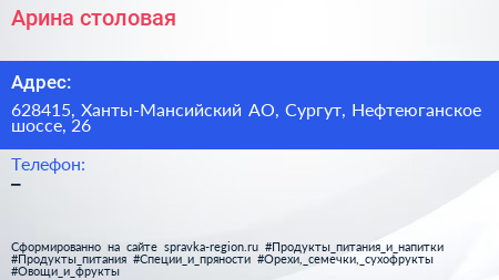 Арина, столовая по адресу 628415, Ханты-Мансийский АО, Сургут, Нефтеюганское шоссе, 26 в дальнейшем Организация, размещена в следующих категориях: