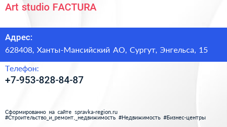 Art studio FACTURA по адресу 628408, Ханты-Мансийский АО, Сургут, Энгельса, 15 в дальнейшем Организация, размещена в следующих категориях: